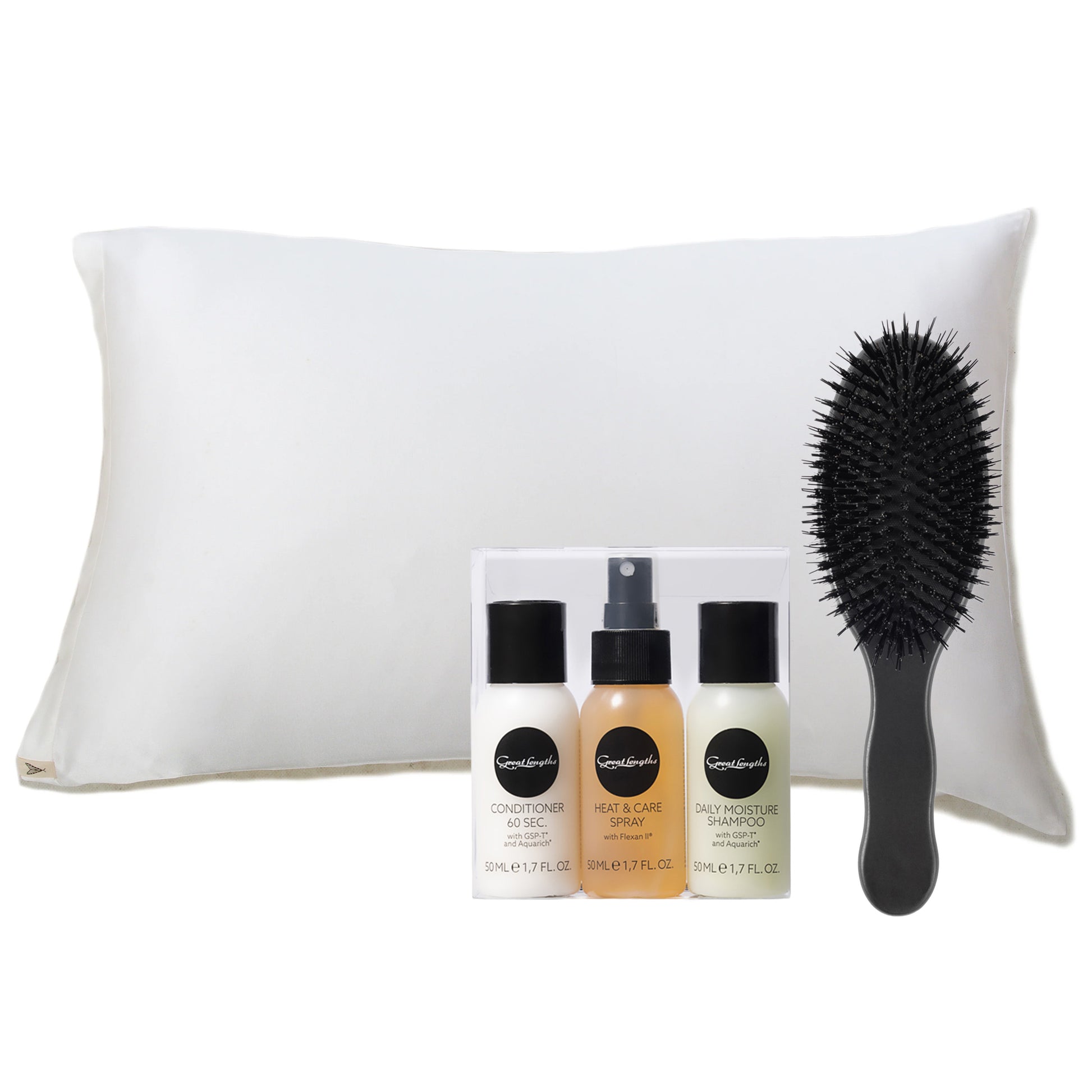 Give your extensions everything they need to stay smooth, glossy and protected with our curated set of Great Lengths travel set trio, medium oval brush and ROKNDOL luxurious silk pillowcase. The ultimate hair care gift.