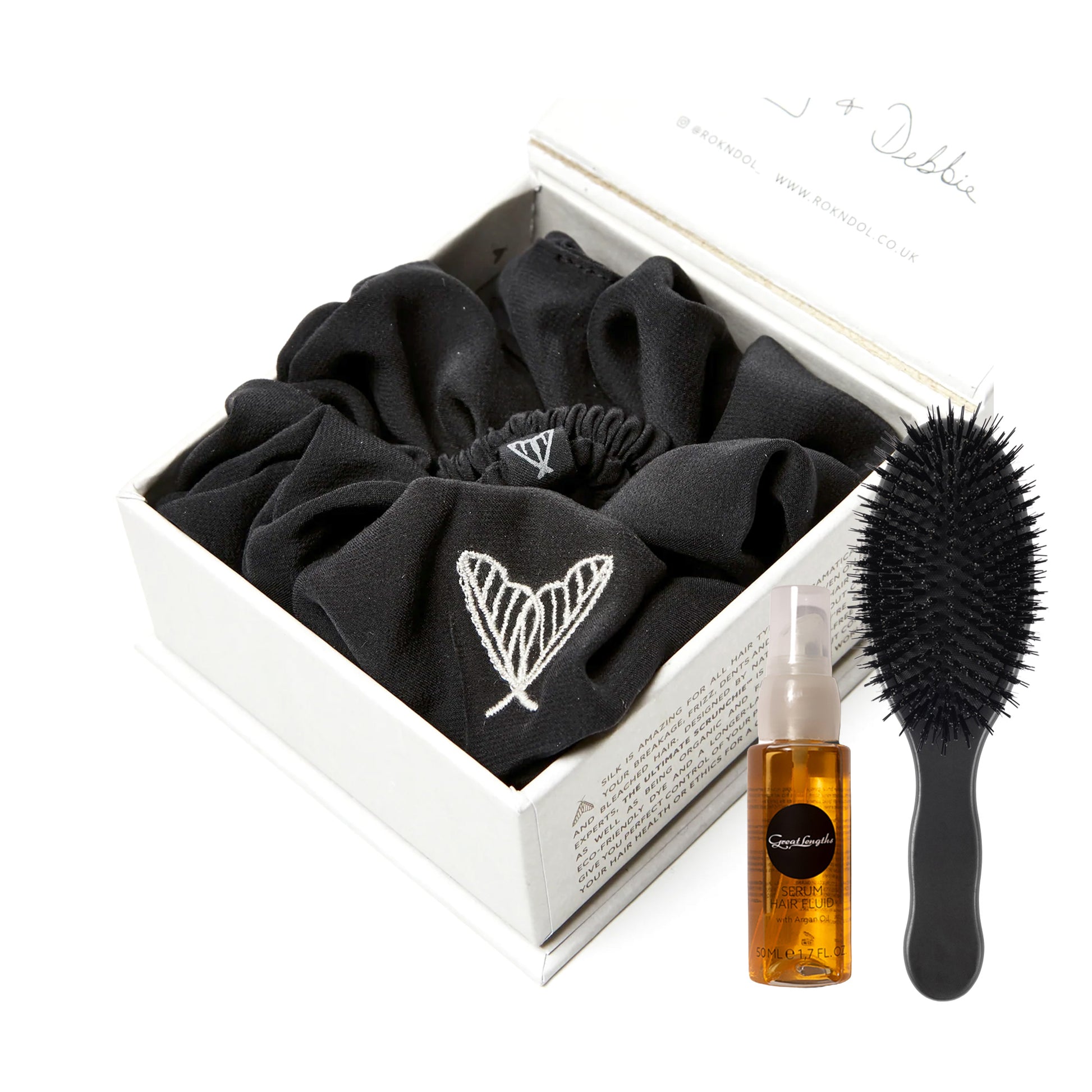 Keep your extensions looking flawless with the RokNShine set featuring our black cruelty-free Silk Scrunchie Duo, Great Lengths Serum Hair Fluid and medium oval brush. The perfect trio for effortless shine and care - an ideal gift.